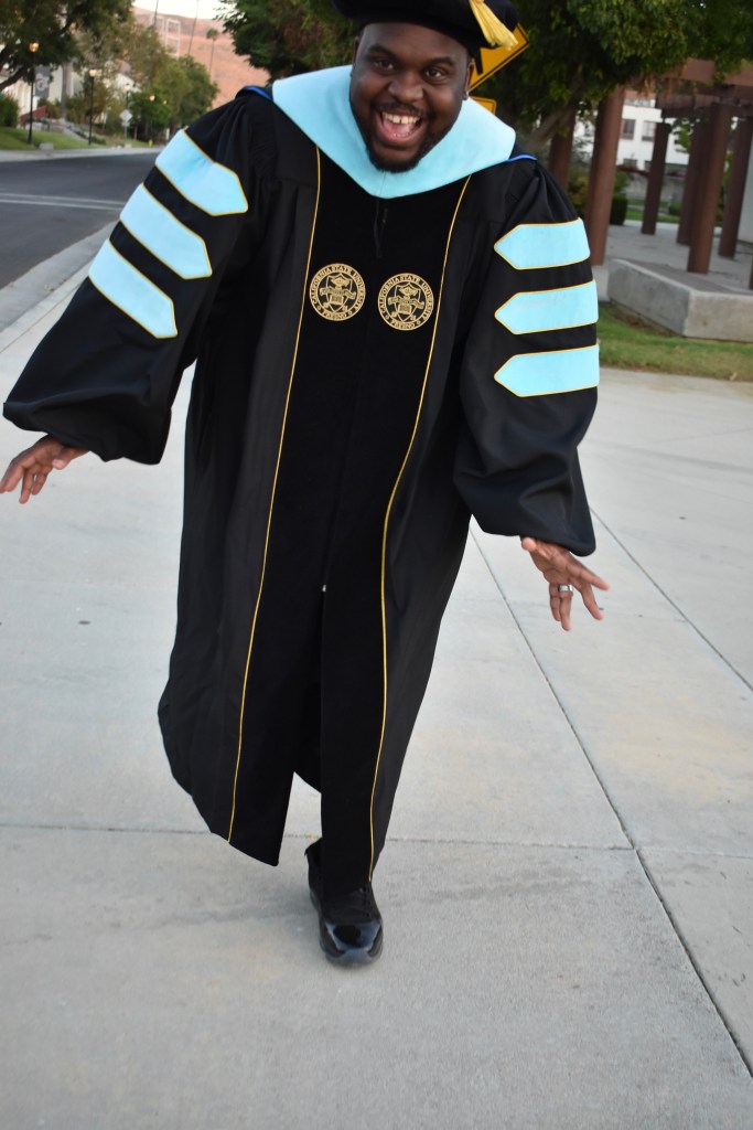 Once I got to the defense, my chair convinced the committee, my work was solid enough to pass, and it was on me not to fuck up. One thing about being an imposter with a Communication degree. You have the gift of gab and can present your ass off. That’s what I did, I presented my findings that proved I was an expert on my topic. My defense was the first time I felt like I belong. I had something to prove to myself. That the kid from South Central/Compton, CA, did what many believe to be impossible.